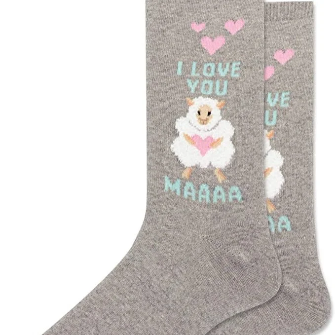 Women's Socks › I Love You Maaaa - Hot Sox Image 1 of 2 Image 2 of 2 I Love You Maaaa - Hot Sox $11.00 Hot SoxOne Size (fits shoe size 5-10)69% cotton, 26% polyester, 3% other fiber, 2% lycra Add To Cart Added! Hot SoxOne Size (fits shoe size 5-10)69% cotton, 26% polyester, 3% other fiber, 2% lycra